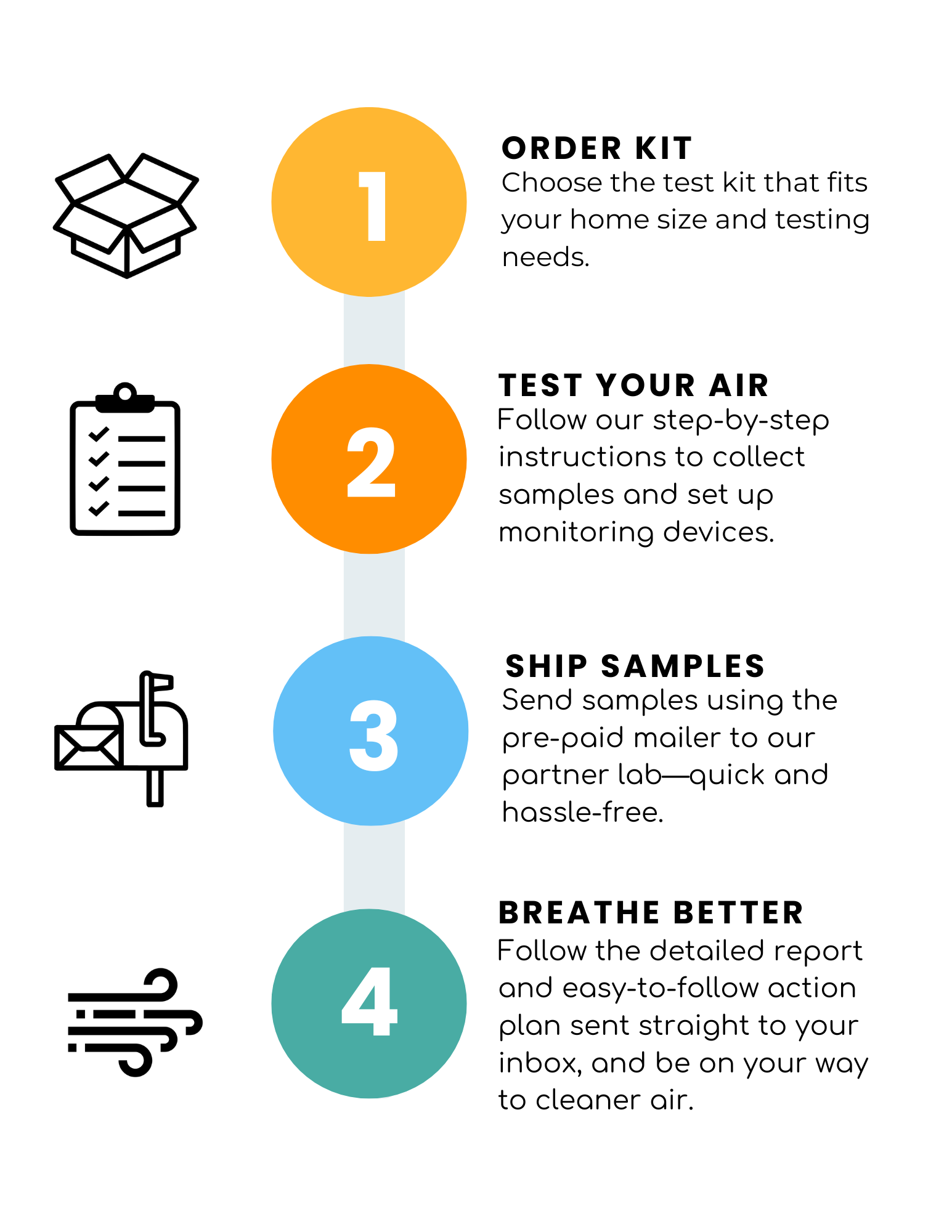 Professional-level indoor air testing, made simple for homeowners. Easy-to-use test kits that screen the most important air quality factors, plus a personalized action plan to improve your air based on your data.
