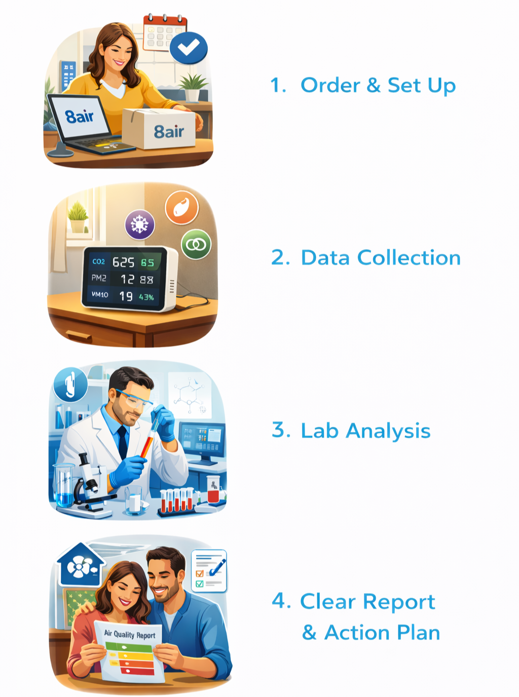 We built 8air to protect our own family’s health — and realized homeowners needed a simple way to understand the air they breathe. Backed by over a decade of environmental testing experience, 8air brings professional-grade insights into your home.